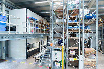 - Ook hier werd een maximale opslagruimte gerealiseerd op een zo klein mogelijk oppervlak, waardoor extra ruimte ontstond voor de montage en het verzendklaar maken van de machines.